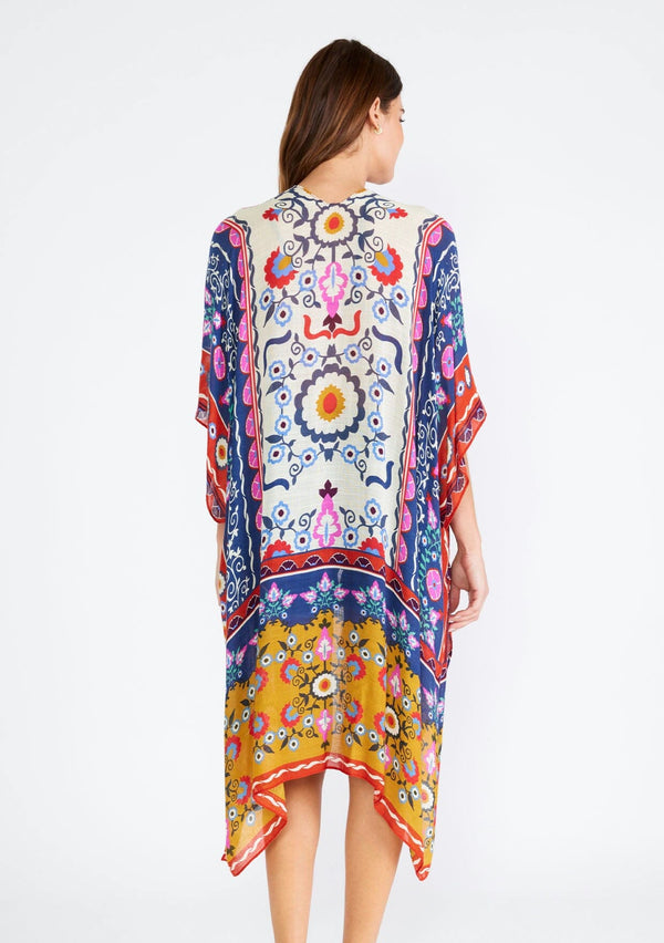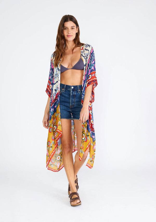 [Color: Taupe/Off White] A model wearing a yellow and white mixed bohemian print kimono. [Color: Taupe/Off White] A model wearing a yellow and white mixed bohemian print kimono.