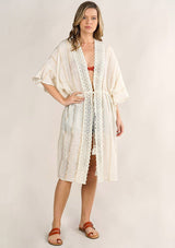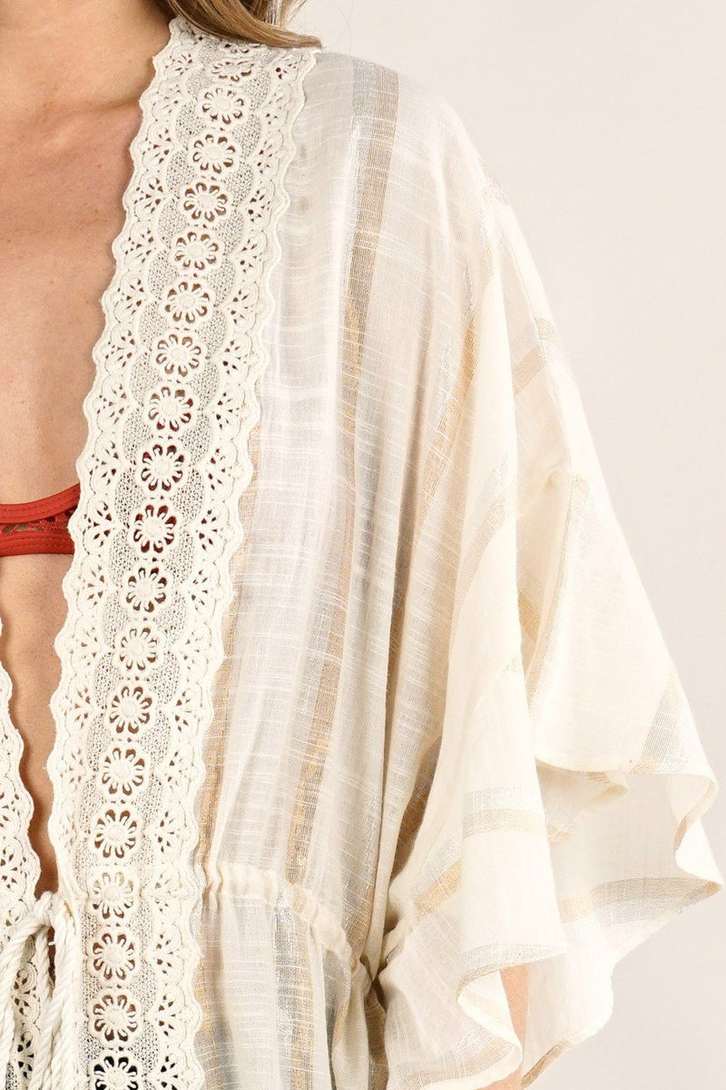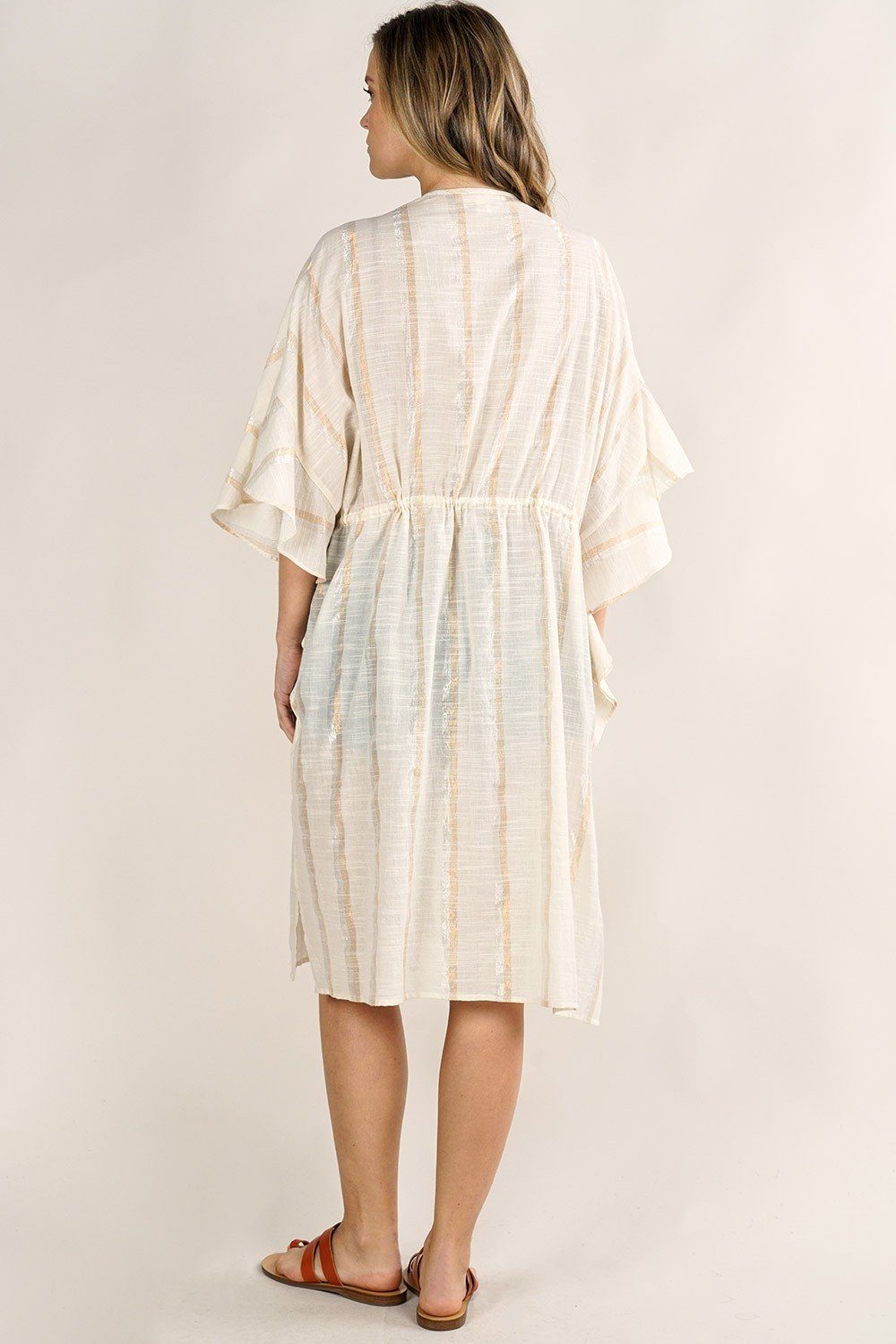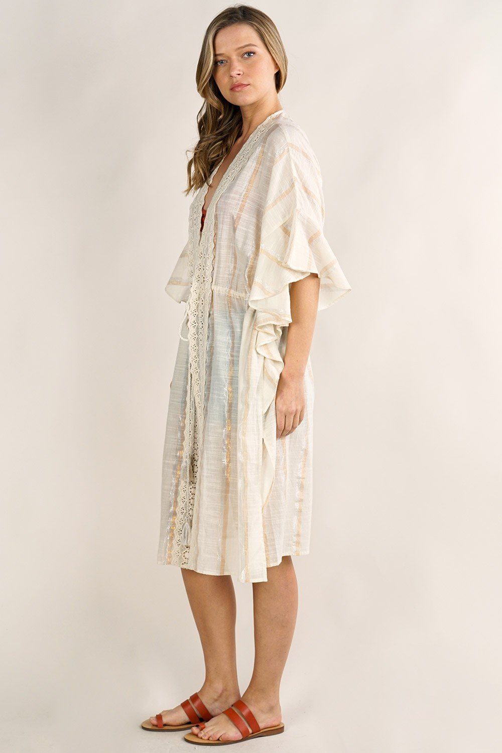 Bring a little glamour to the beach with our light-catching gold metallic stripe caftan. A lightweight cotton style featuring a flirty 3/4 length flutter sleeve, a delicate lace trim, and a tassel tie front. All that's missing is a tropical cocktail!