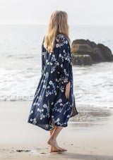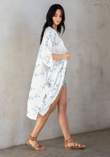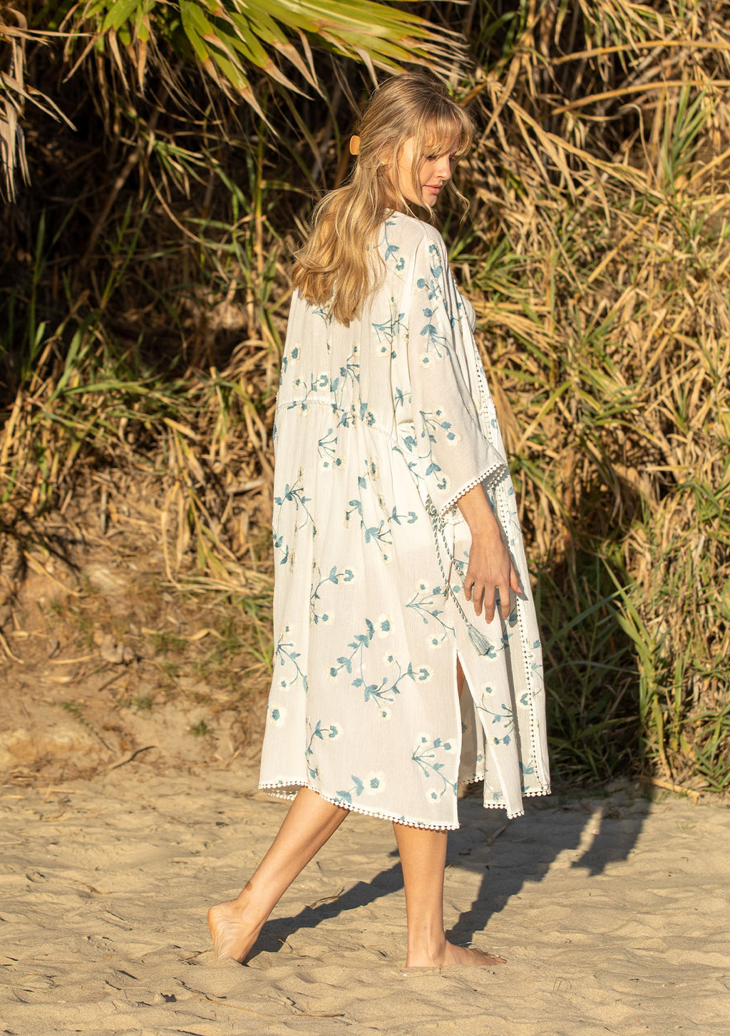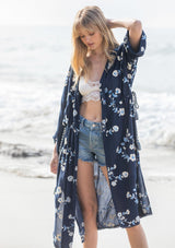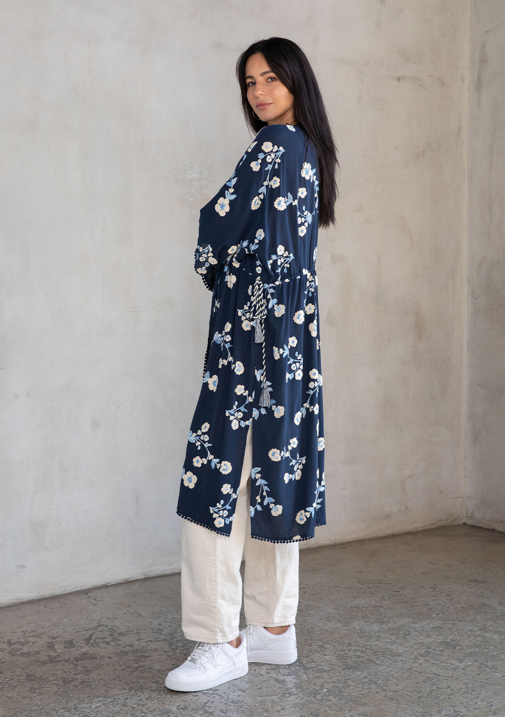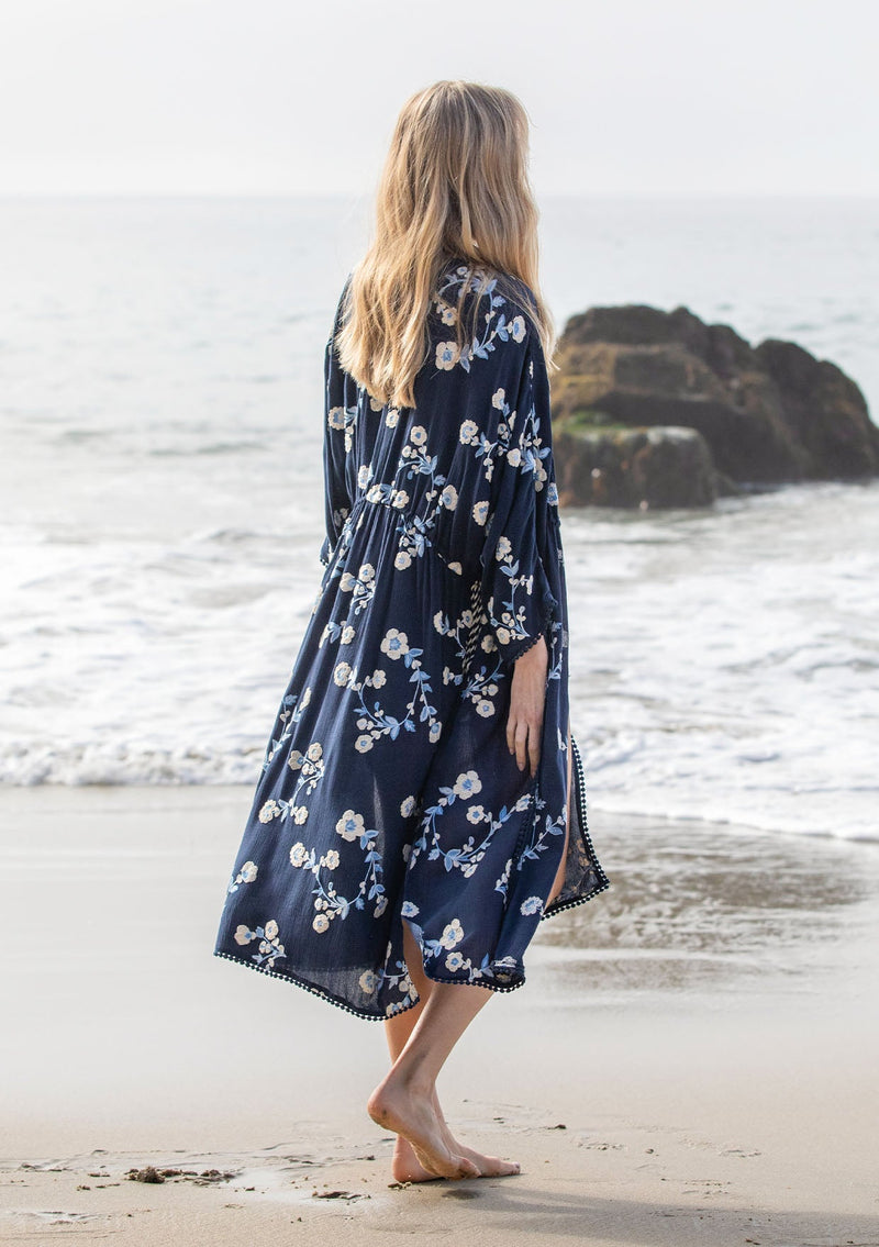 Shop NowBohemian floral embroidery elevates this dreamy mid-length kimono. Features flowy 3/4 length kimono sleeves, a delicate pom pom trim, and breezy side slits. The drawstring sides can be adjusted for a cinched or loose look.