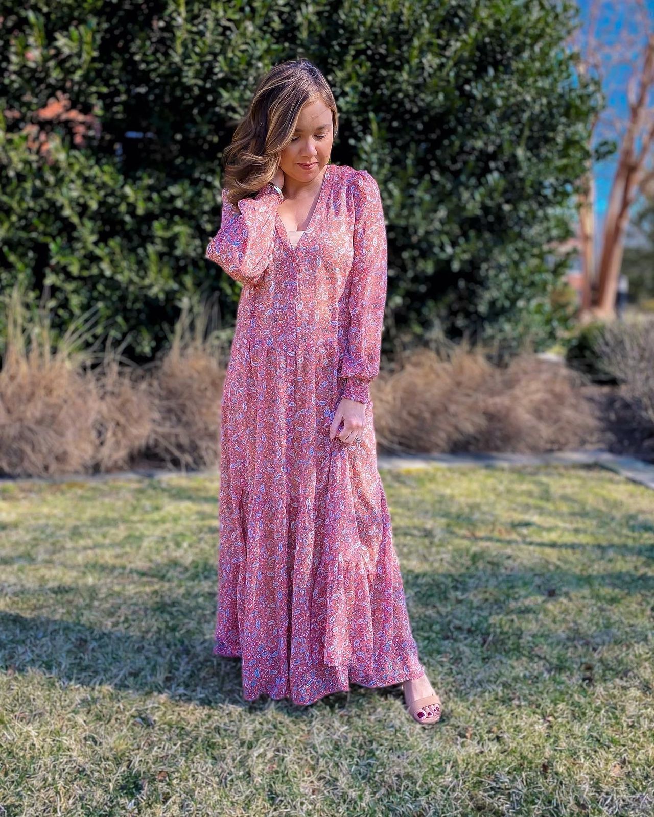 Designed in a bohemian paisley print, this dazzling sheer chiffon maxi dress features light-catching gold metallic lurex details. With a pretty self-covered button front and flattering long voluminous sleeves. Pairs effortlessly with a strappy sandal and simple gold jewelry.
