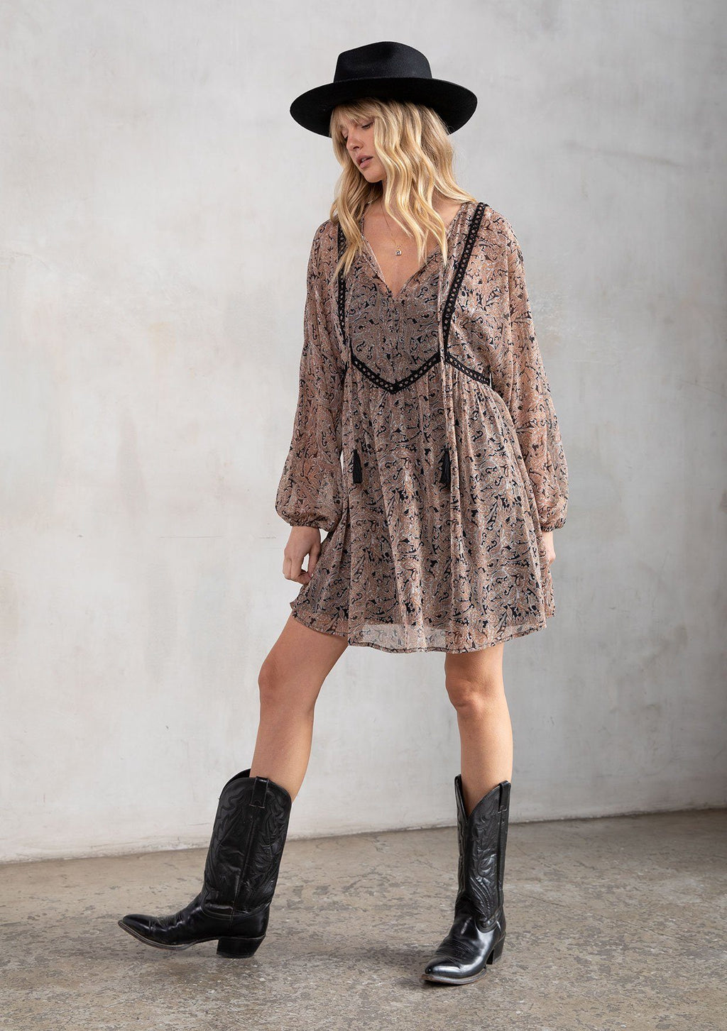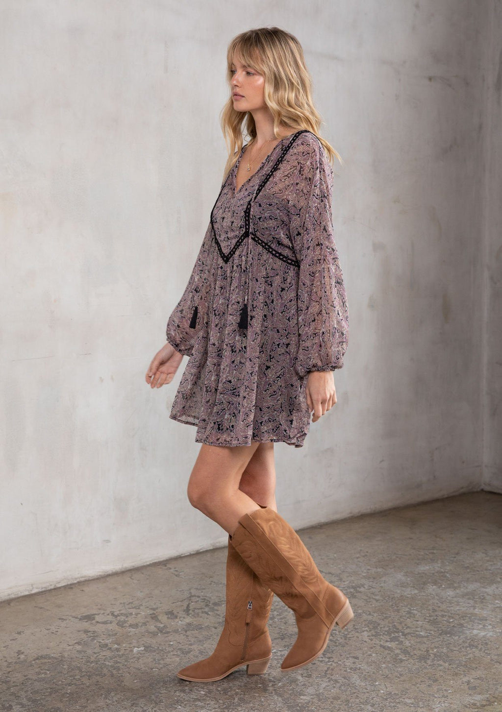 Fall meets the 70s in this swingy bohemian babydoll mini dress. Designed in an autumnal paisley print, featuring a split v-neckline and tassel ties, voluminous long sleeves, and a flowy silhouette. The contrast crochet trim adds a vintage touch to this modern boho style.