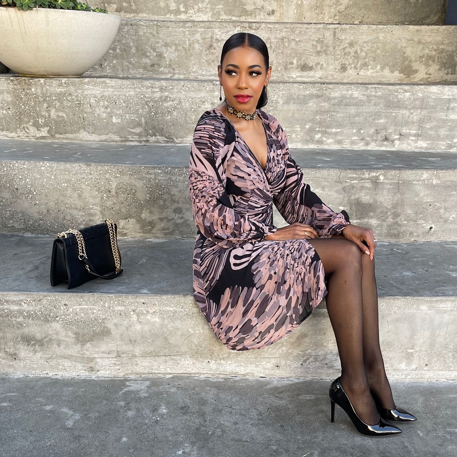 A unique abstract butterfly wing print adds a trendy touch to this classic bohemian wrap mini dress. With voluminous long sleeves, a plunging v-neckline, and a side tie closure with an o-ring detail.