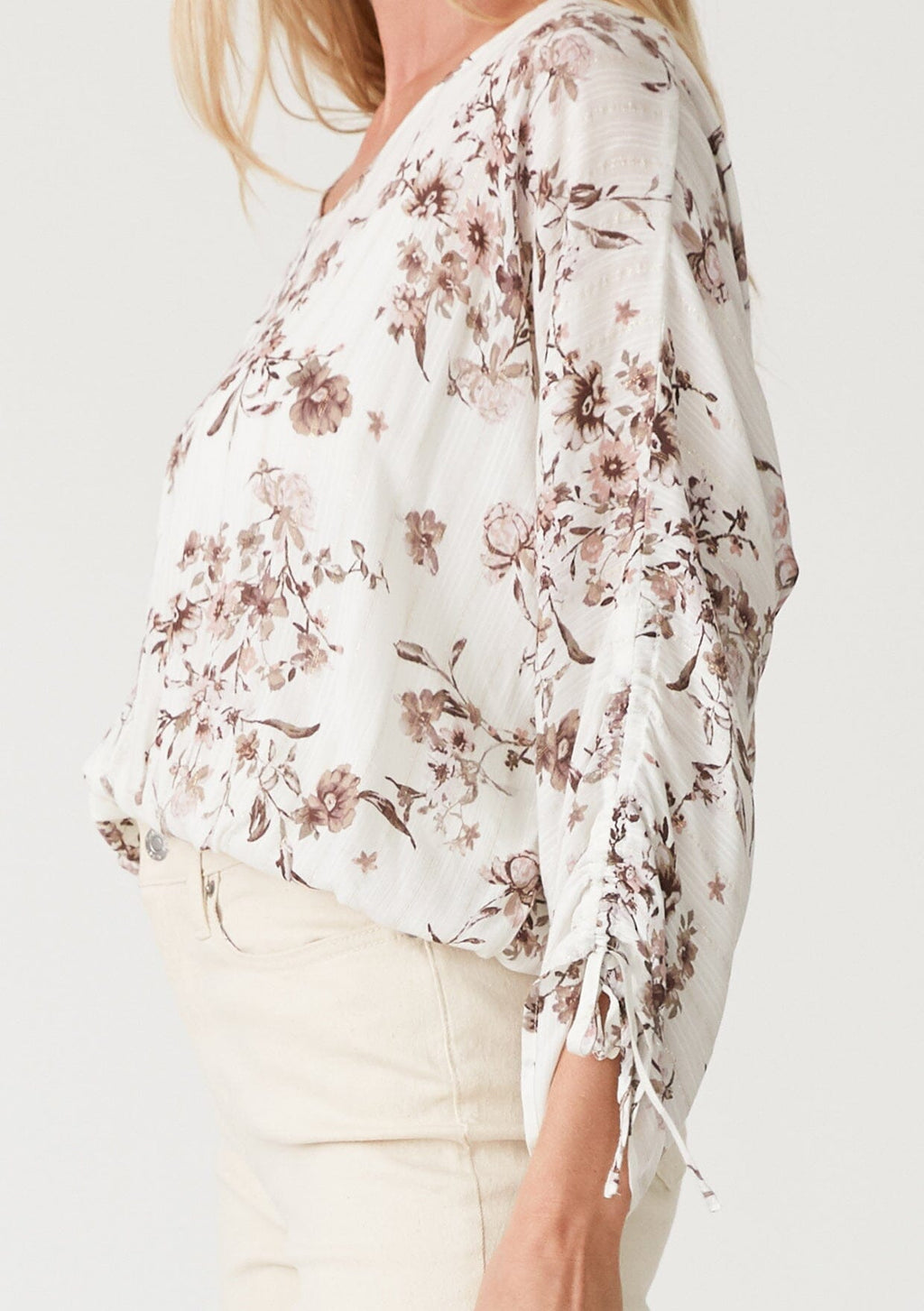 A classic bohemian top in a floral print with a ruched sleeve and metallic thread detail.