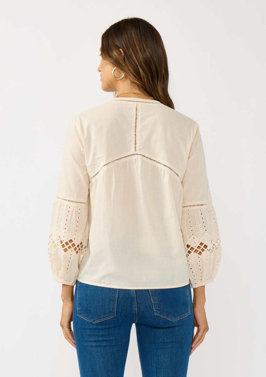 ![[Color: Natural] A side facing image of a blonde model wearing an ivory lightweight cotton-blend top with a tie front detail, button front, and 3/4 length sleeves with embroidered and cutout details.](http://www.shoplovestitch.com/cdn/shop/files/Lovestitch_07312025_22_5679aa2a-75fc-47f3-9a12-717202e1d5e9_160x.jpg?v=1755200891)