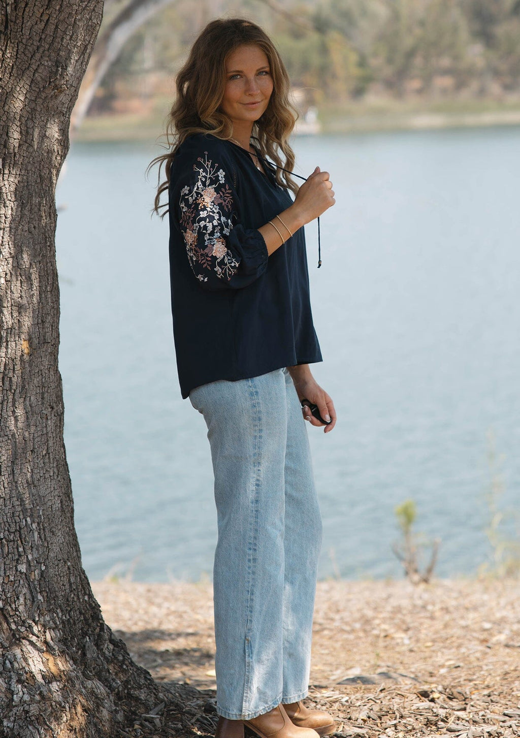 A Lovestitch favorite, loved for its intricate embroidery and timeless charm. Featuring a classic split v-neckline with a delicate tie detail and comfortable 3/4 sleeves, this top adds a touch of free-spirited romance to your everyday wardrobe. Pair it with vintage denim and flats for an effortlessly casual look.