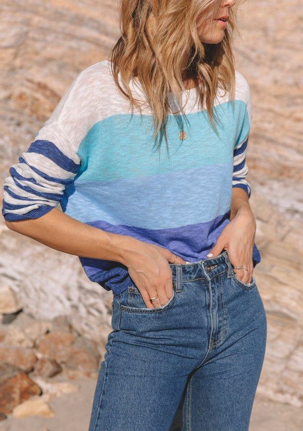 ![[Color: Peach/Aqua/Navy] A back facing image of a blonde model wearing a multi stripe lightweight knit sweater with a round neckline, long sleeves, and a dropped shoulder.](http://www.shoplovestitch.com/cdn/shop/files/I-50884K-RCW_PEACH-AQUA-NAVY-B_{width}x.jpg?v=1731040190)