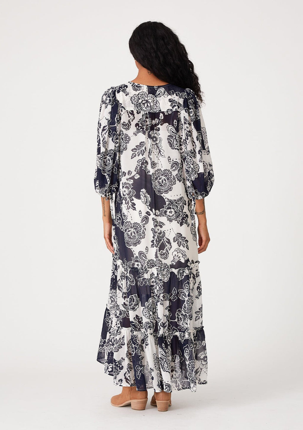 Shop The SaleA vintage-inspired boho maxi dress in a stunning blue and white floral print, crafted from lightweight chiffon.
