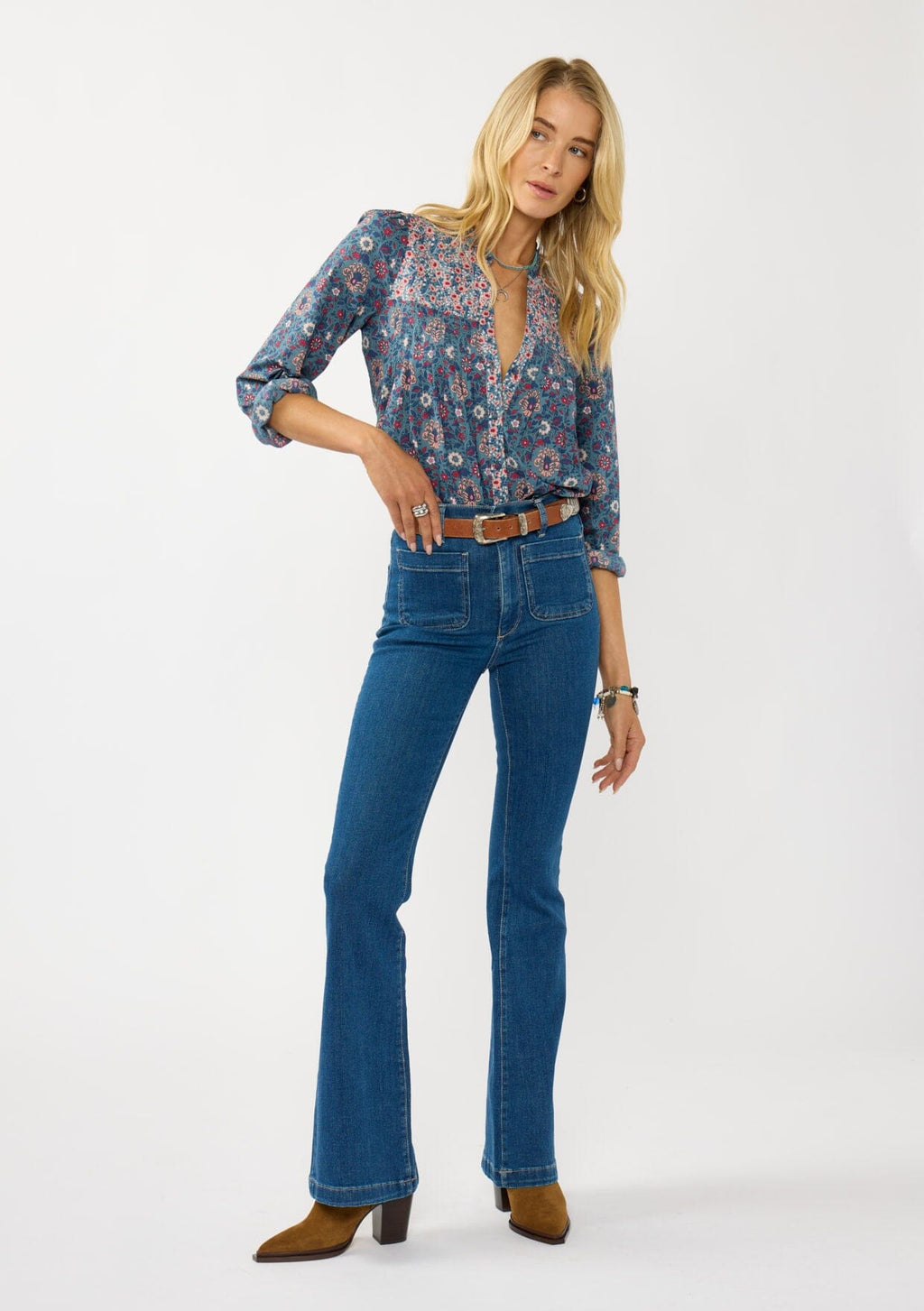A bohemian blouse with a vintage-inspired touch, from the teal floral print to the quilted patch yoke. Featuring a self-covered button front, split v-neckline, and ruffled collar, this modern boho piece maintains a polished look. We love to style this top with a patch pocket denim for an effortless fall look.