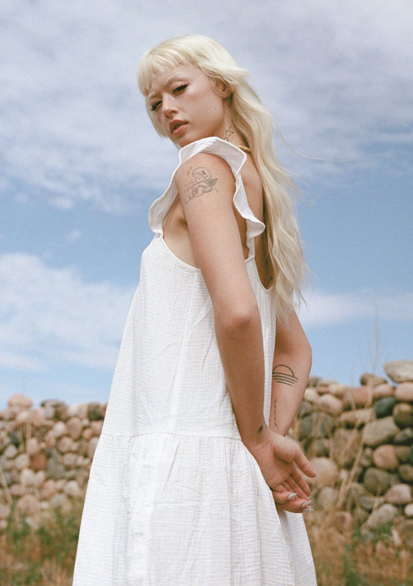 [Color: Off White] A model wearing a classic white maxi dress designed in soft cotton gauze. With a scooped neckline, adjustable ruffled straps, and side pockets.[Color: Off White] A model wearing a classic white maxi dress designed in soft cotton gauze. With a scooped neckline, adjustable ruffled straps, and side pockets.