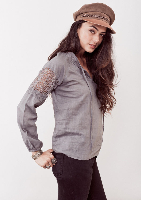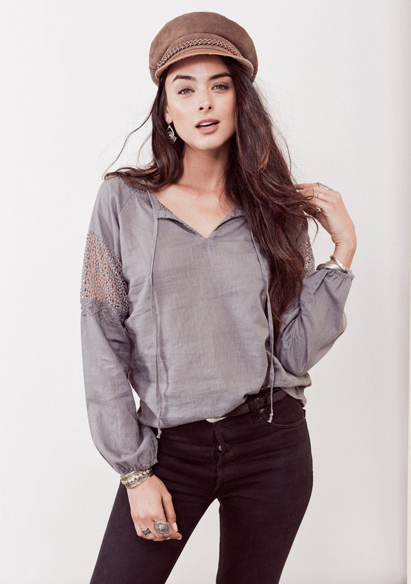 [Color: Natural/Wine] A model wearing a sheer chiffon peasant top in a pink and natural mixed bohemian print. With long voluminous sleeves, a split neckline with tassel ties, and a button front.[Color: Natural/Wine] A model wearing a sheer chiffon peasant top in a pink and natural mixed bohemian print. With long voluminous sleeves, a split neckline with tassel ties, and a button front.