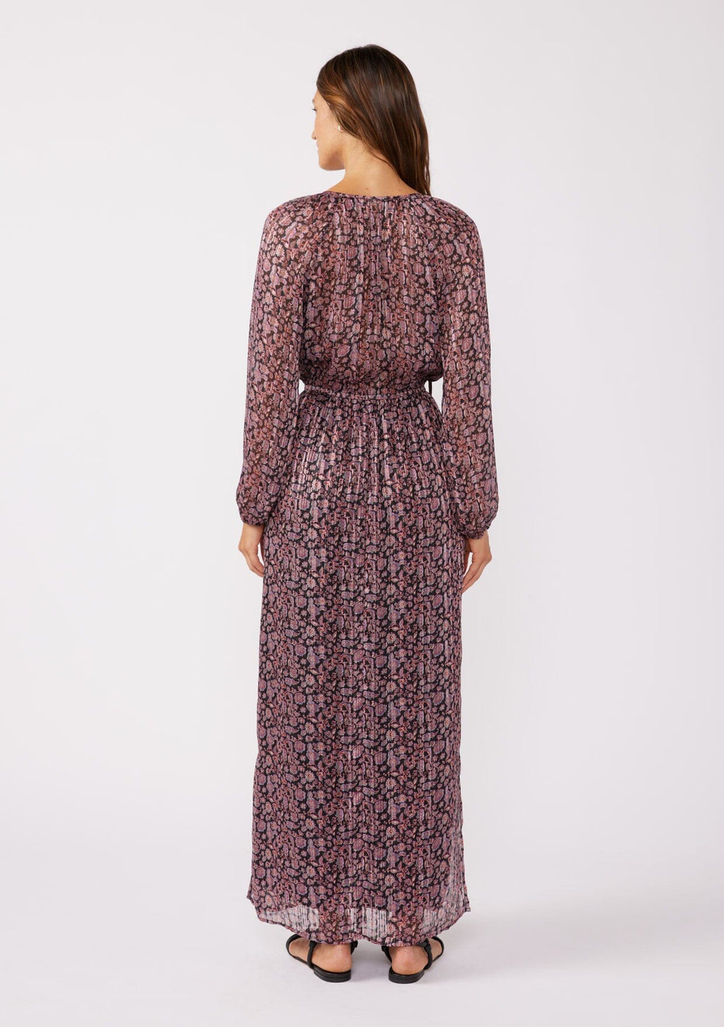 A timeless bohemian maxi dress in a rich purple floral print, elevated with shimmering metallic lurex stripes.