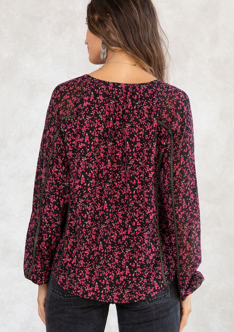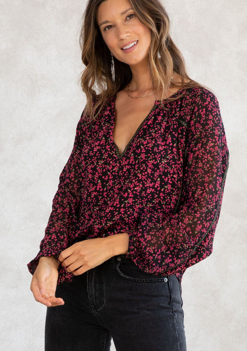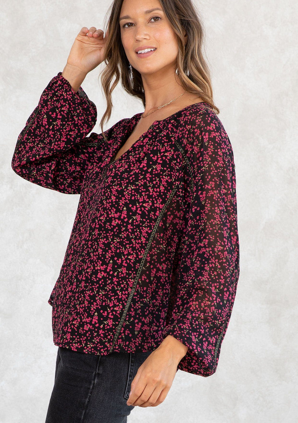 Shop NowA bohemian take on holiday dressing. Our chiffon peasant top is designed in a delicate ditsy floral print. With long voluminous raglan sleeves, a split v-neckline, and a relaxed, flowy fit. The gold thread trim throughout adds an opulent, light-catching element.