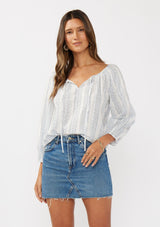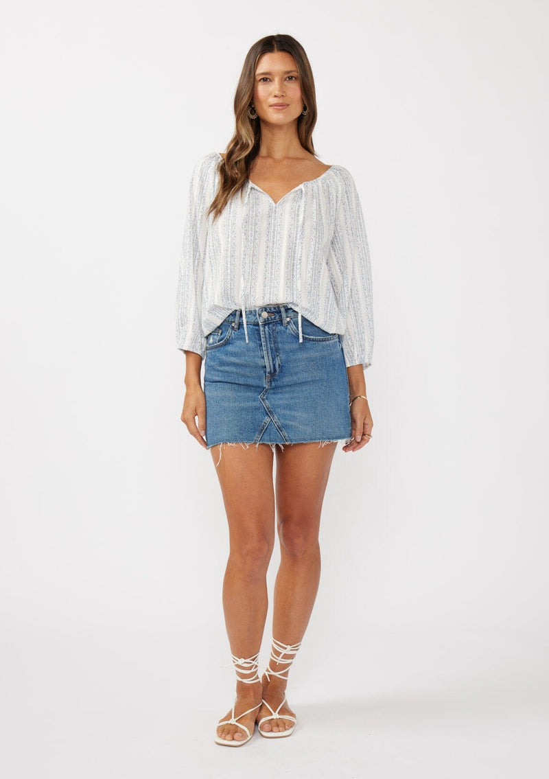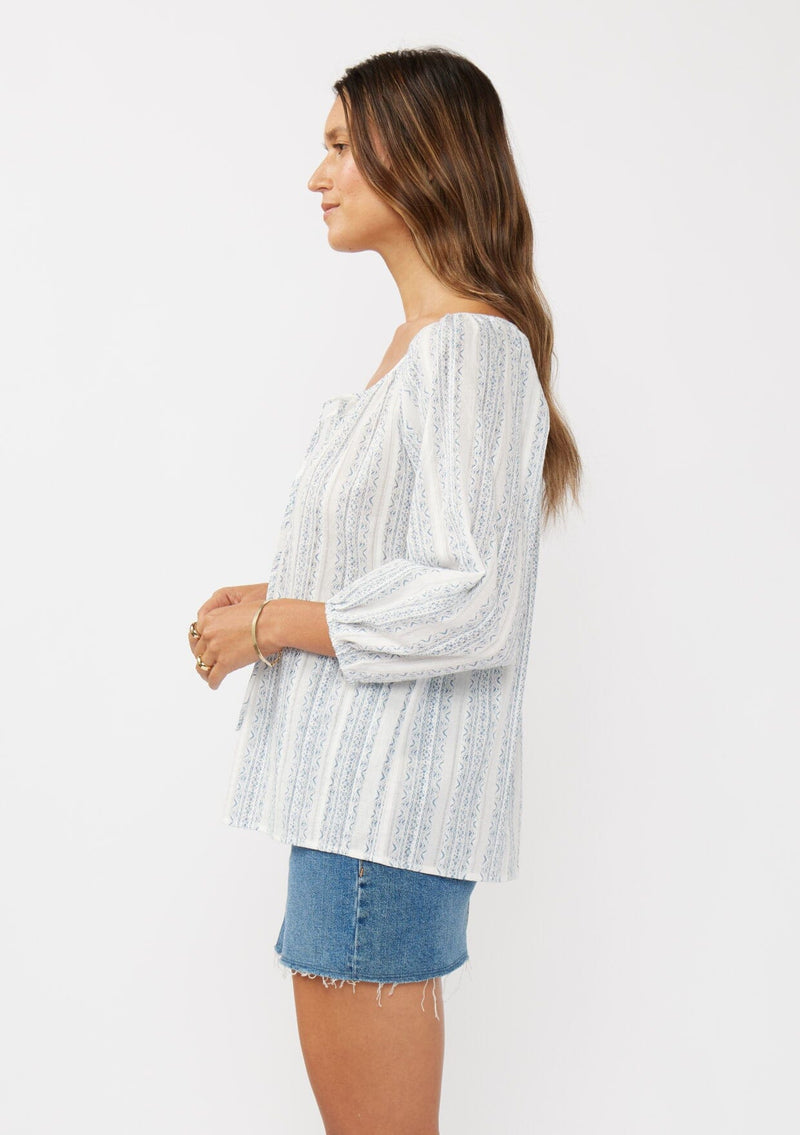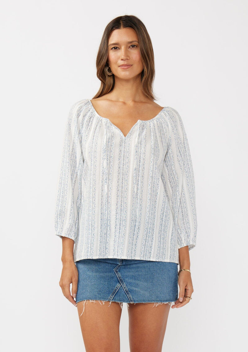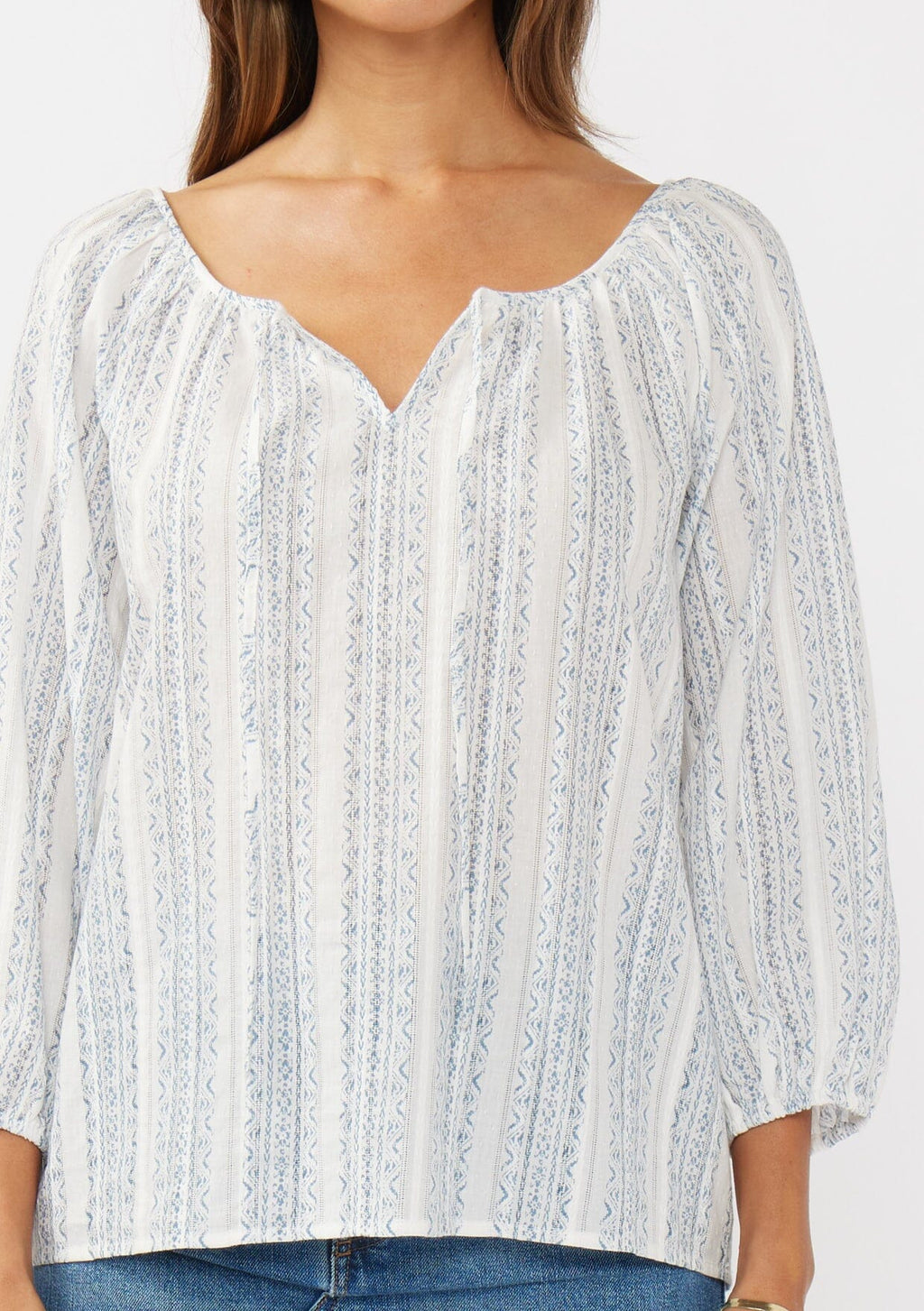 Shop NowA bohemian blouse with a white & blue striped pattern.