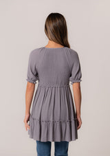 ![[Color: Light Grey] A back facing image of a brunette model wearing a bohemian spring tunic top in a light grey crinkled fabric. With short puff sleeves, ruffle trim, a v neckline, a smocked bodice, an empire waist, and a flowy tiered body.](http://www.shoplovestitch.com/cdn/shop/products/I-15064W-MPJ_LIGHTGREY-B_160x.jpg?v=1748480837)
