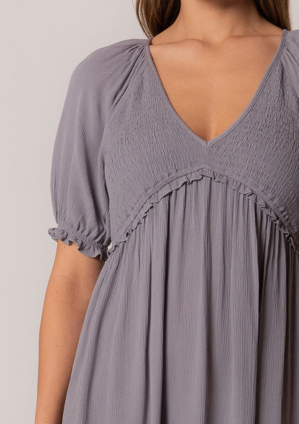 ![[Color: Light Grey] A close up front facing image of a brunette model wearing a bohemian spring tunic top in a light grey crinkled fabric. With short puff sleeves, ruffle trim, a v neckline, a smocked bodice, an empire waist, and a flowy tiered body.](http://www.shoplovestitch.com/cdn/shop/products/I-15064W-MPJ_LIGHTGREY-D_160x.jpg?v=1748480837)
