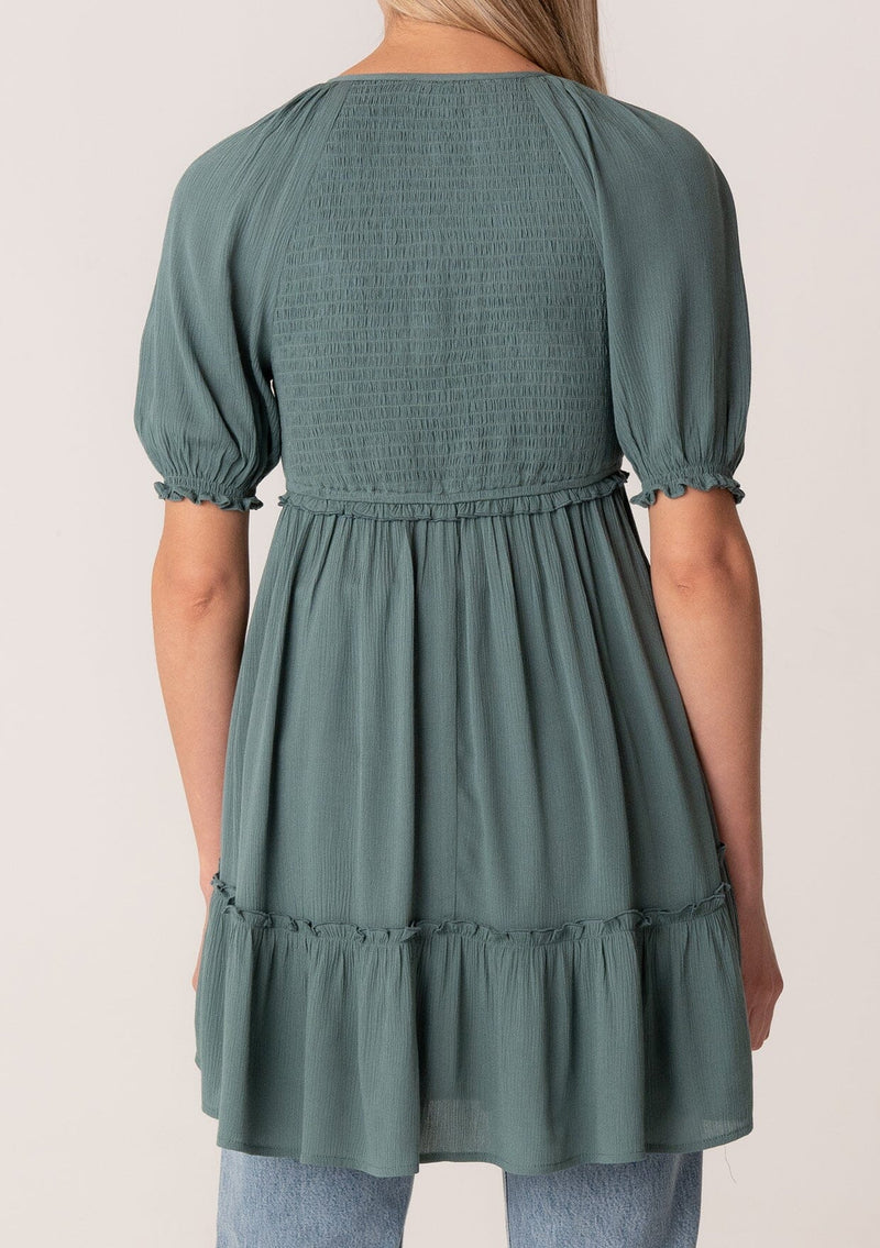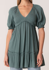 Elevate your bohemian style with our ultra-chic spring tunic top! This flowy and relaxed style features short puff sleeves and a smocked bodice, creating a flattering empire waist silhouette with ruffle details.