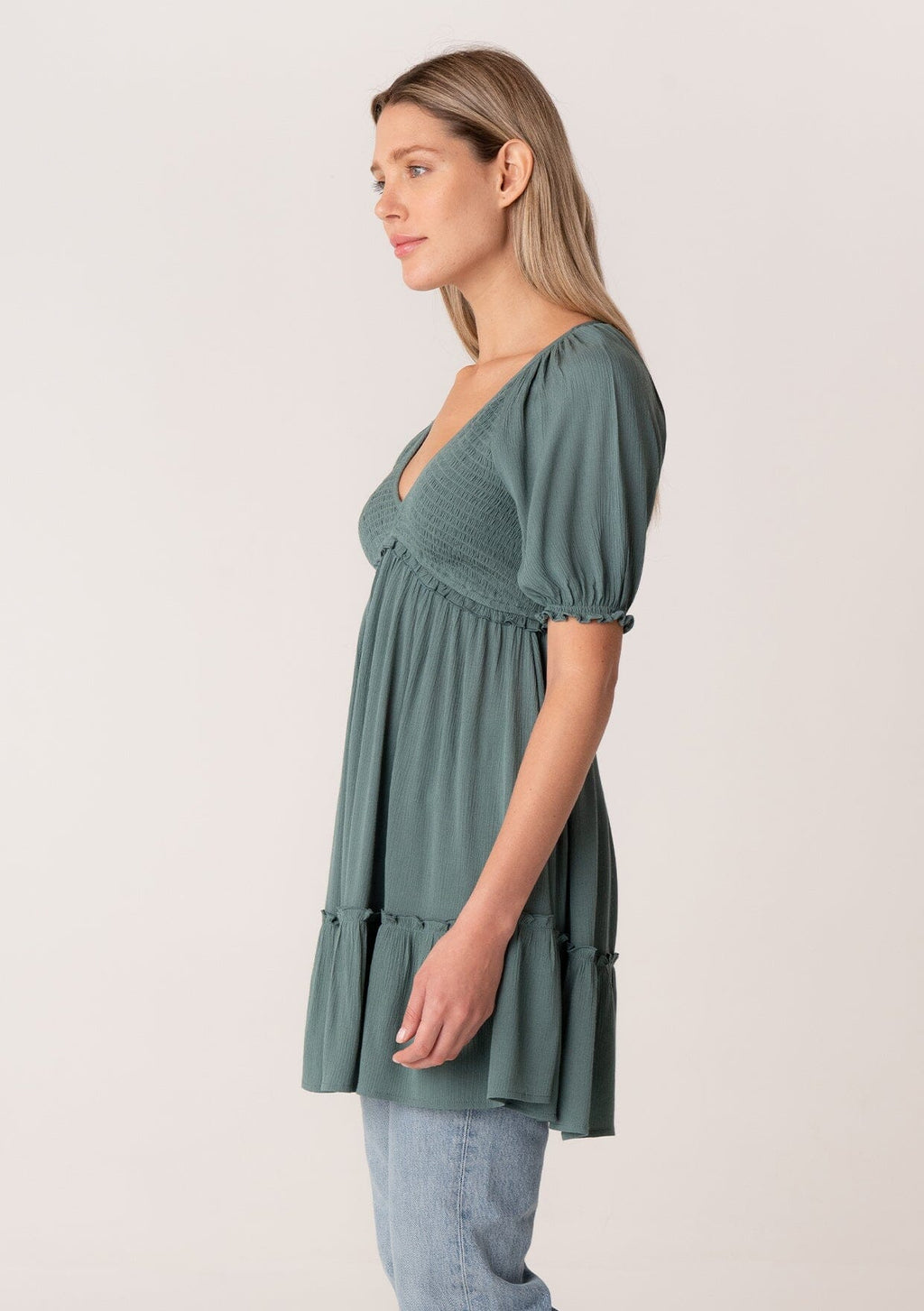 ![[Color: Light Grey] A side facing image of a brunette model wearing a bohemian spring tunic top in a light grey crinkled fabric. With short puff sleeves, ruffle trim, a v neckline, a smocked bodice, an empire waist, and a flowy tiered body.](http://www.shoplovestitch.com/cdn/shop/products/I-15064W-MPJ_LIGHTGREY-S_160x.jpg?v=1748480837)