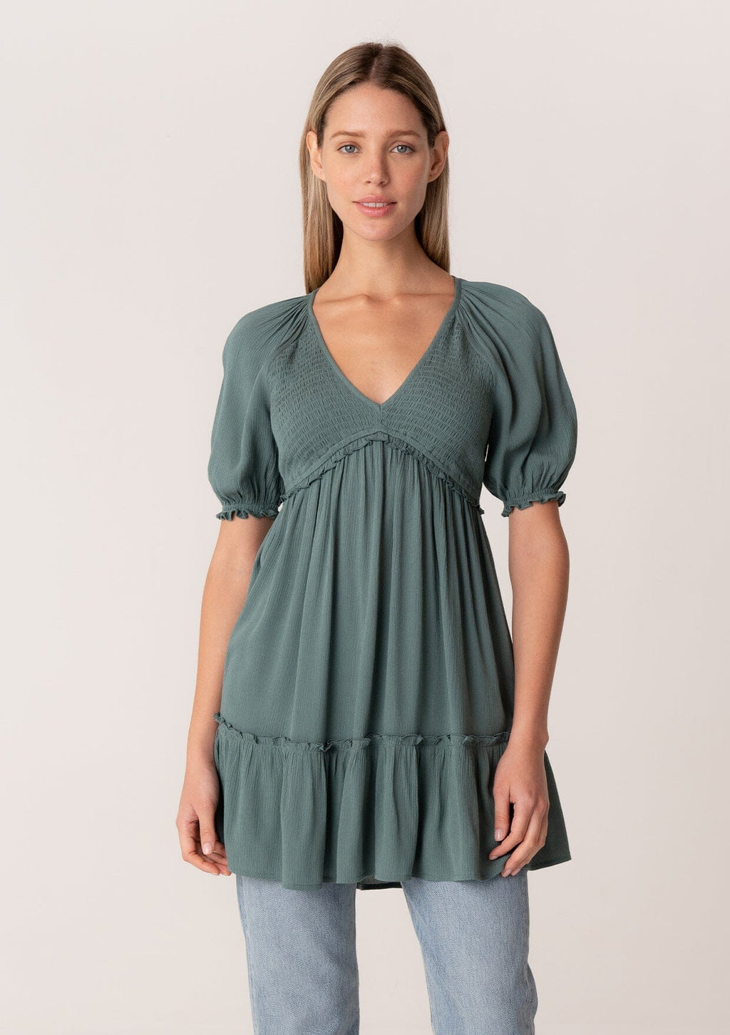 ![[Color: Light Grey] A front facing image of a brunette model wearing a bohemian spring tunic top in a light grey crinkled fabric. With short puff sleeves, ruffle trim, a v neckline, a smocked bodice, an empire waist, and a flowy tiered body.](http://www.shoplovestitch.com/cdn/shop/products/I-15064W-MPJ_LIGHTGREY_c2f1dd1f-e712-48ff-8a37-709801b1eba4_160x.jpg?v=1748480837)