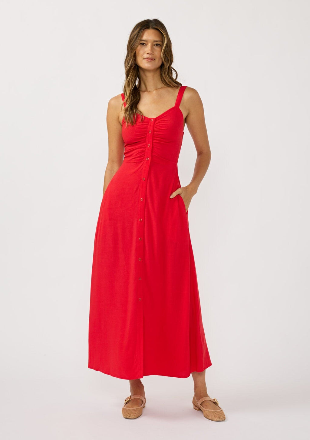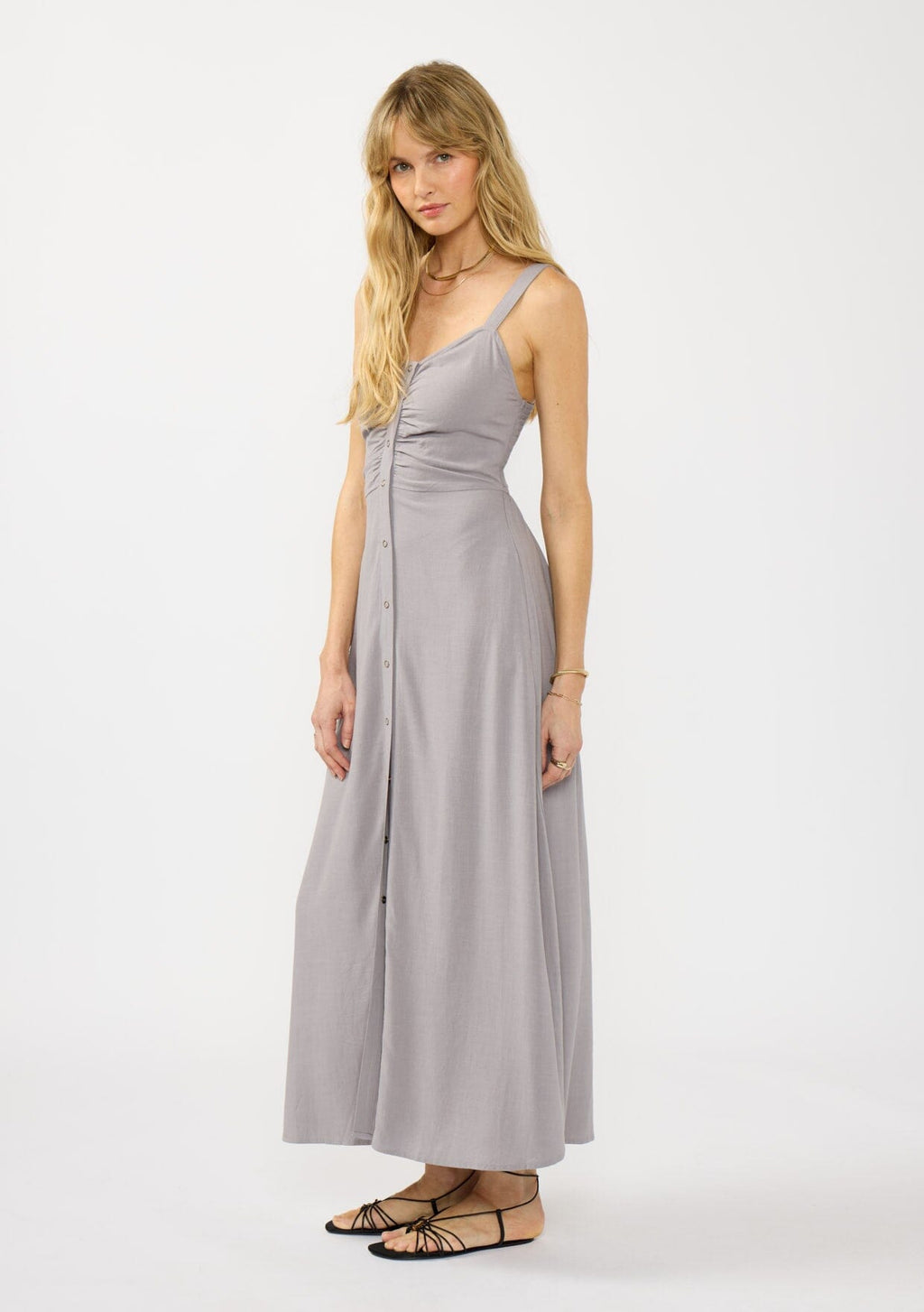 A timeless piece made for easy days and effortless nights. This classic maxi dress flows with grace and comfort, featuring a snap-button front, ruched bust, and a smocked back for a flattering fit. Whether you're dressing it up with heels for date night or keeping it casual with flats, this versatile style fits right into any occasion.