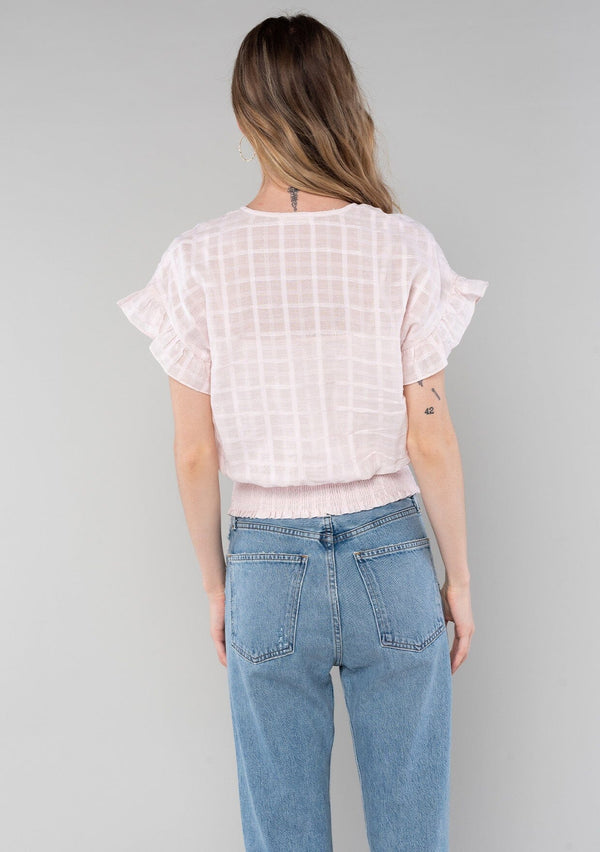 [Color: Light Pink] A back facing image of a blonde model wearing a light pink cotton bohemian top with short ruffled sleeves, a smocked elastic waist, and a surplice faux wrap front with a v neckline. [Color: Light Pink] A front facing image of a blonde model wearing a light pink cotton bohemian top with short ruffled sleeves, a smocked elastic waist, and a surplice faux wrap front with a v neckline.