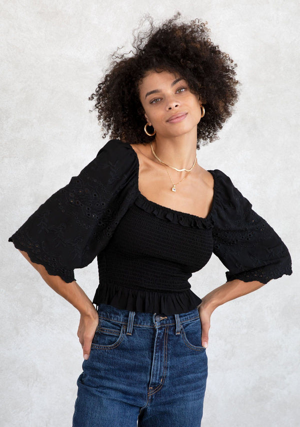 [Color: Black] A model wearing a classic black bohemian mini dress with embroidered eyelet detail, a smocked bodice, half length puff sleeves, and a flowy lined skirt. [Color: Black] A model wearing a classic black bohemian mini dress with embroidered eyelet detail, a smocked bodice, half length puff sleeves, and a flowy lined skirt.