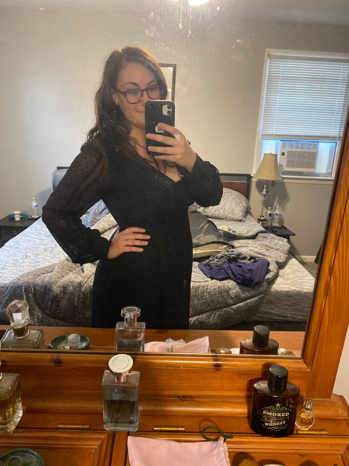 Love how it fits and the quality of the material. I’m 7 months pregnant and I look adorable on it. Love the front slit too. Looks sexy(ish) but classy if you want to show off legs, pedi or sandals. Got it size M and I’m weighting 155-160 pounds. I’m 5’4” tall. It has adjustable waist “bands” to make your belly fit. Not sure if I’ll be able to wear it until the end of pregnancy but my bump is small so maybe but it is a little tight on the belly. I will be using it for my maternity photos though. And since it’s roomy I will most likely be wearing it postpartum and beyond. Happy with my purchase!