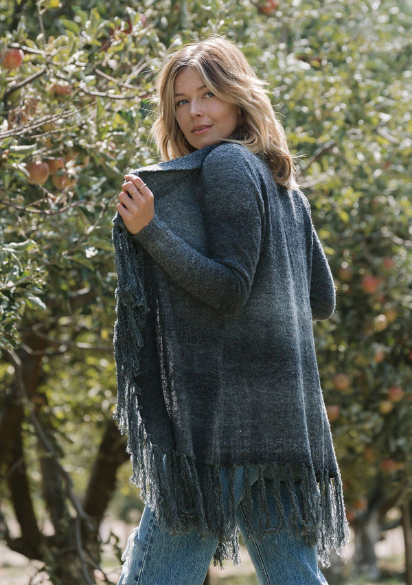 [Color: Dark Grey] A front facing image of a brunette model wearing a grey cardigan with a sheer back. Featuring cozy ribbed sleeves, and open front, and shawl collar. A casual fall style for effortless layering. [Color: Dark Grey] A back facing image of a brunette model wearing a grey cardigan with a sheer back. Featuring cozy ribbed sleeves, and open front, and shawl collar. A casual fall style for effortless layering.