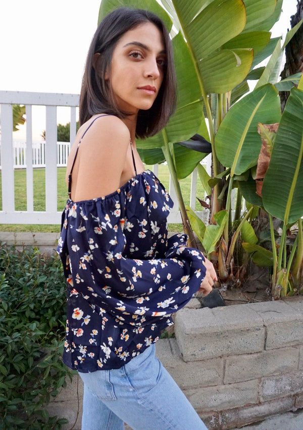 [Color: Black/Fuchsia] A model wearing a pretty black and fuchsia floral blouse with a ruffled off the shoulder neckline and an adjustable spaghetti strap. [Color: Black/Fuchsia] A model wearing a pretty black and fuchsia floral blouse with a ruffled off the shoulder neckline and an adjustable spaghetti strap.
