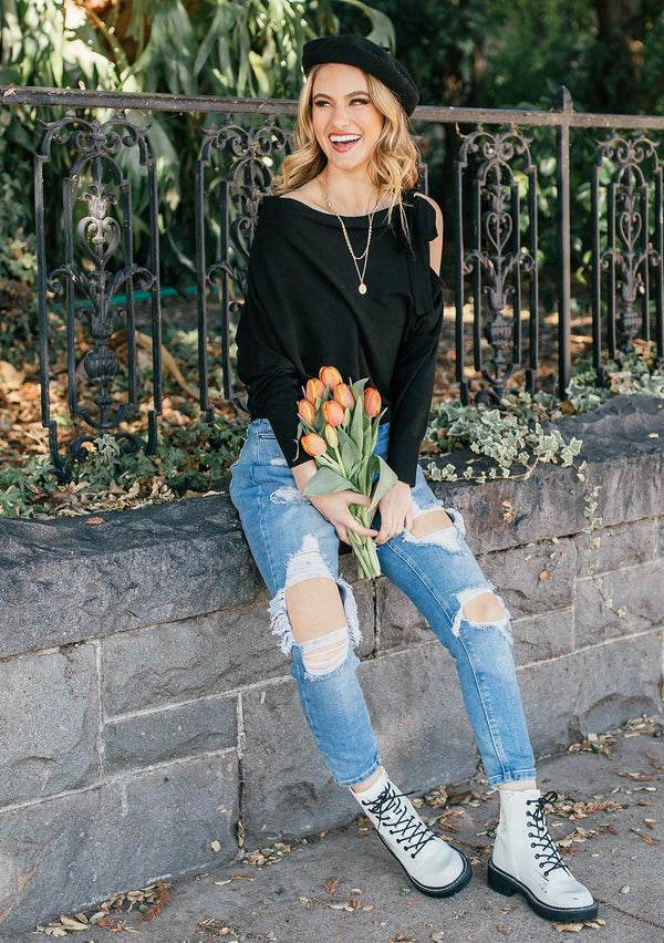 [Color: Black] A girl wearing a black oversized cozy pullover sweater.[Color: Black] A girl wearing a black oversized cozy pullover sweater.