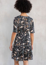 The ultimate Spring mini dress has arrived! Our fit and flare dress is designed in a whimsical floral print. Featuring flirty short flutter sleeves, a flattering v-neckline, and a smocked elastic waist in the back for definition.