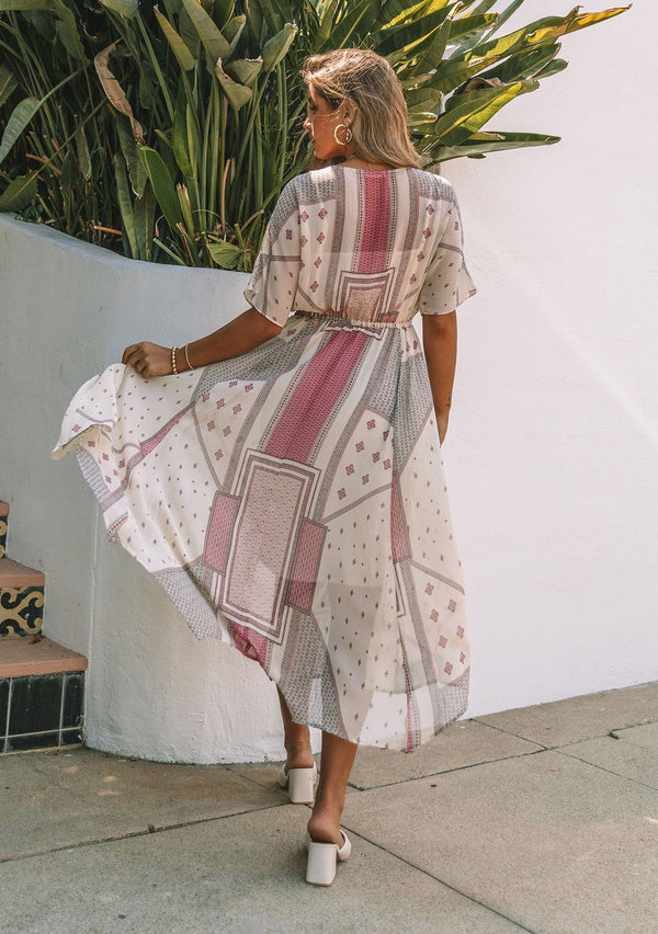 [Color: Dusty Blush/Wine] A close up side facing image of a blonde model standing outside wearing a bohemian maxi dress designed in a pink floral print and crafted from textured chiffon. With short dolman sleeves, a surplice v neckline, an open back with tie closure, and a flowy asymmetric hemline skirt.[Color: Dusty Blush/Wine] A side facing image of a blonde model standing outside wearing a bohemian maxi dress designed in a pink floral print and crafted from textured chiffon. With short dolman sleeves, a surplice v neckline, an open back with tie closure, and a flowy asymmetric hemline skirt.