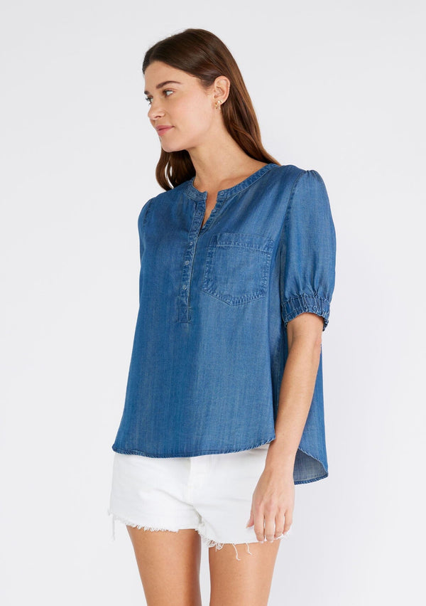 [Color: Navy/Berry] A close up front facing image of a black model wearing a navy blue and berry purple vintage floral print top with short flutter sleeves and a button front. [Color: Navy/Berry] A front facing image of a black model wearing a navy blue and berry purple vintage floral print top with short flutter sleeves and a button front.
