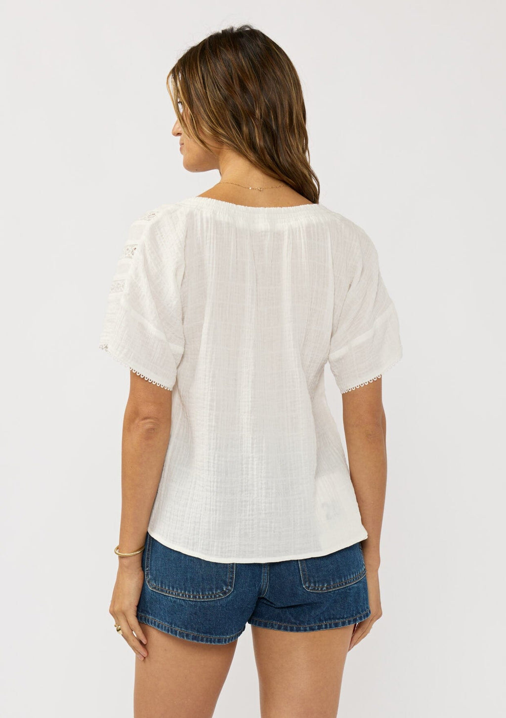 Made from soft, breathable cotton gauze, this short sleeve top features delicate lace trim and a classic button-front design. It brings a relaxed boho feel to everyday dressing and pairs seamlessly with your favorite denim for an effortlessly laid-back look.