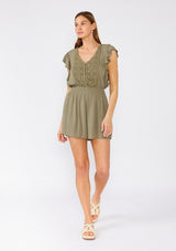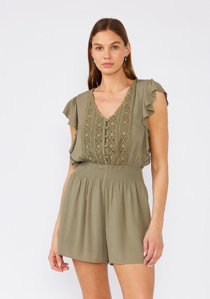 A timeless summer style, our ultra-boho short romper features a crochet top, short flutter sleeves, and a delicate self-covered button front. Crafted from lightweight crinkle gauze. We love to style this easy one-and-done style with a simple brown leather sandal.
