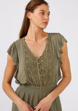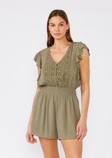 ![[Color: Olive] A back facing image of a brunette model wearing an olive green bohemian short romper. With short flutter sleeves, a v neckline, a crochet top, a self covered button front top, and a smocked elastic waist.](http://www.shoplovestitch.com/cdn/shop/files/greenromperwithdetailsandhairaccessories_0011_LOVESTITCH_022120242000_160x.jpg?v=1748479688)