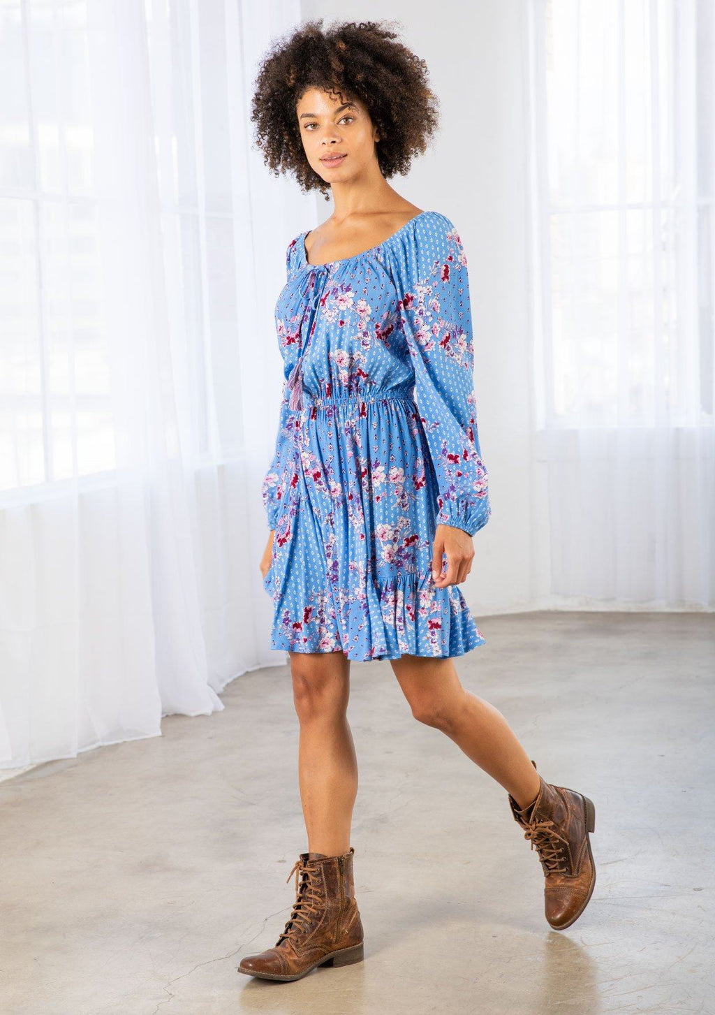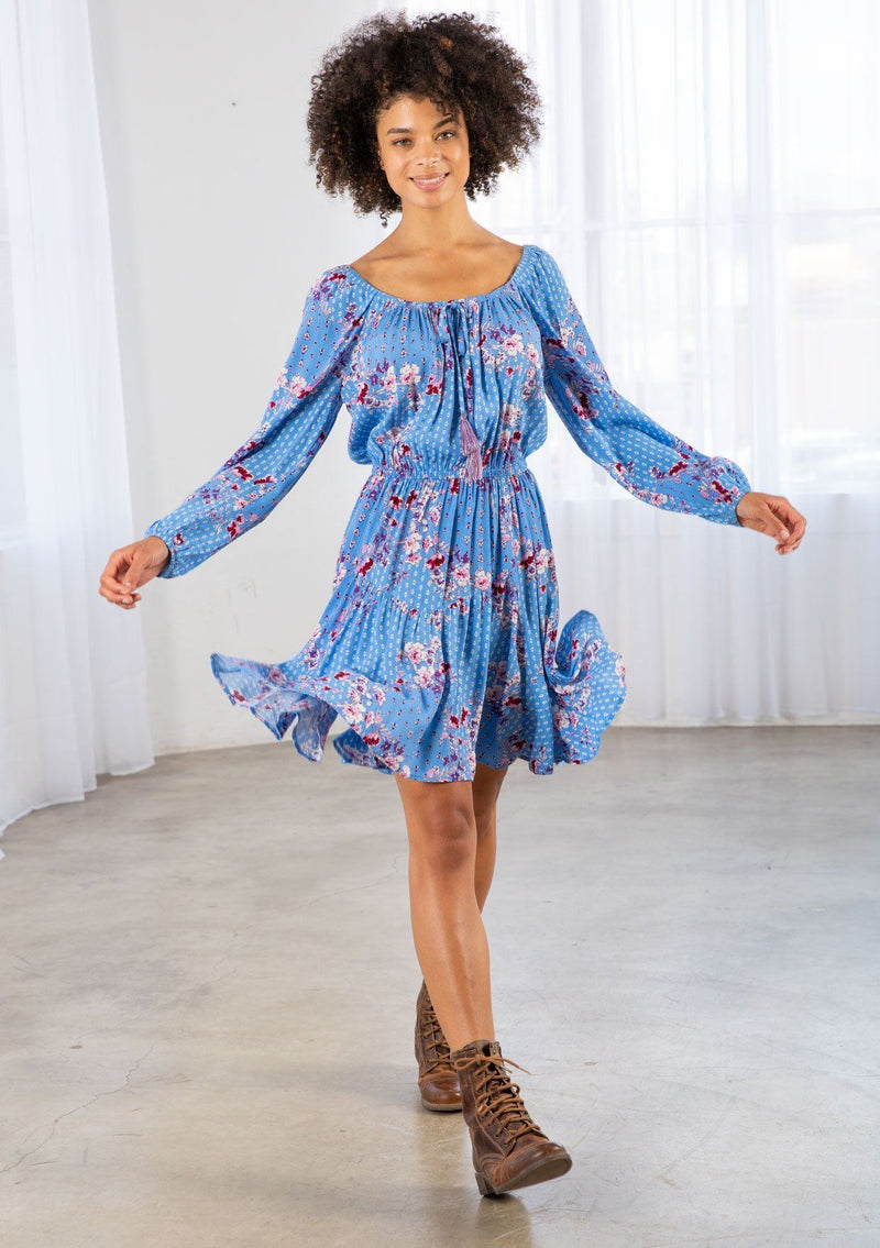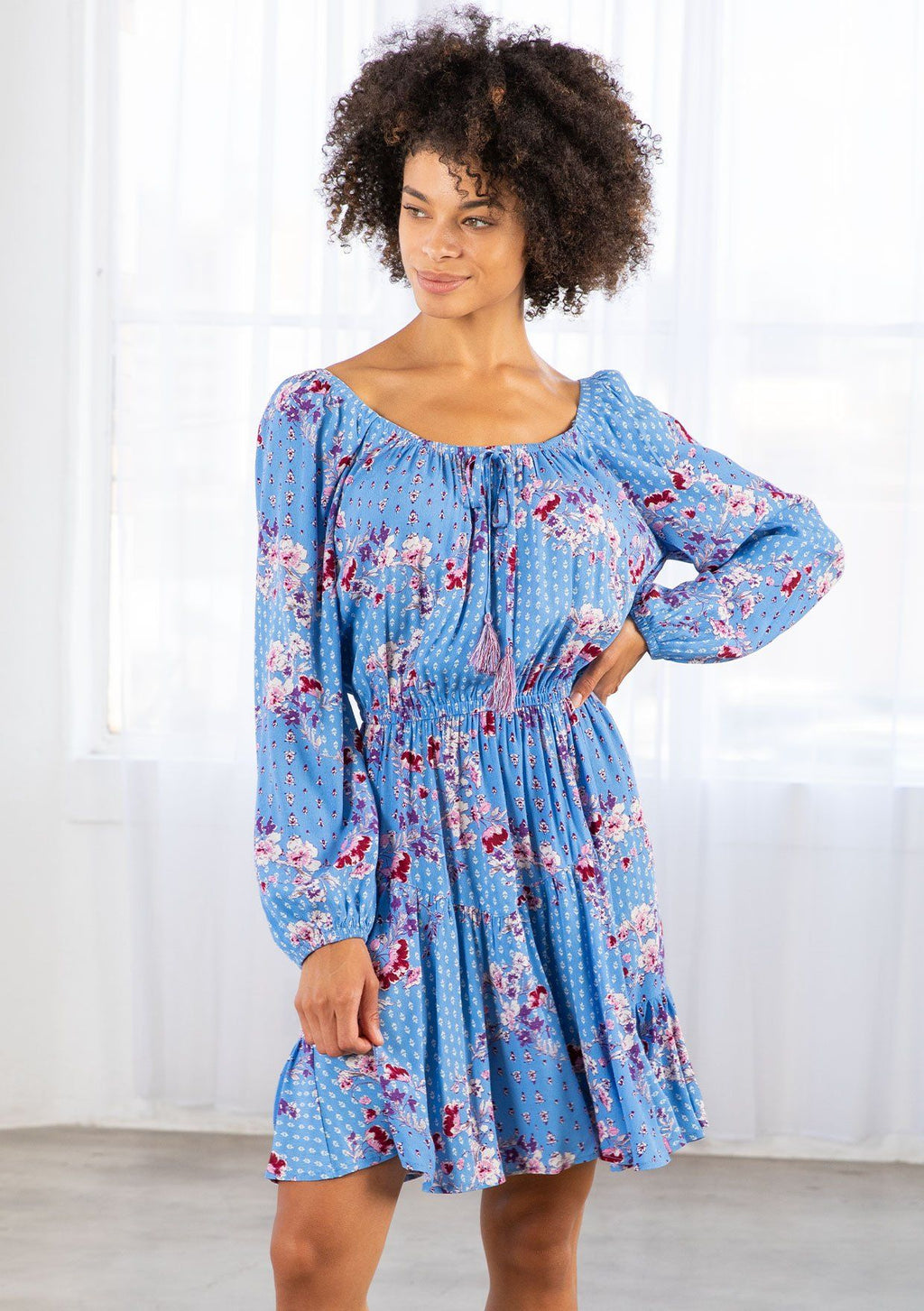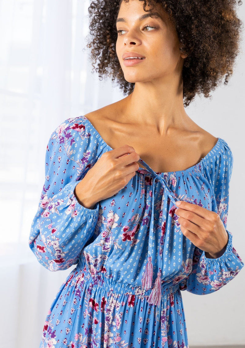 A fresh take on a timeless style, our bohemian mini dress is designed in a vibrant blue floral print. Featuring long voluminous sleeves, an elastic waist for definition, and a charming tassel tie front. The round elastic neckline can be worn off or on the shoulder.