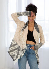 With whimsical fringe details, this statement cardigan adds a bohemian touch to any outfit. Featuring a cozy shawl collar, warm long sleeves, and contrast trim. We love to pair this easy sweater with jeans and boots for a cool fall look.