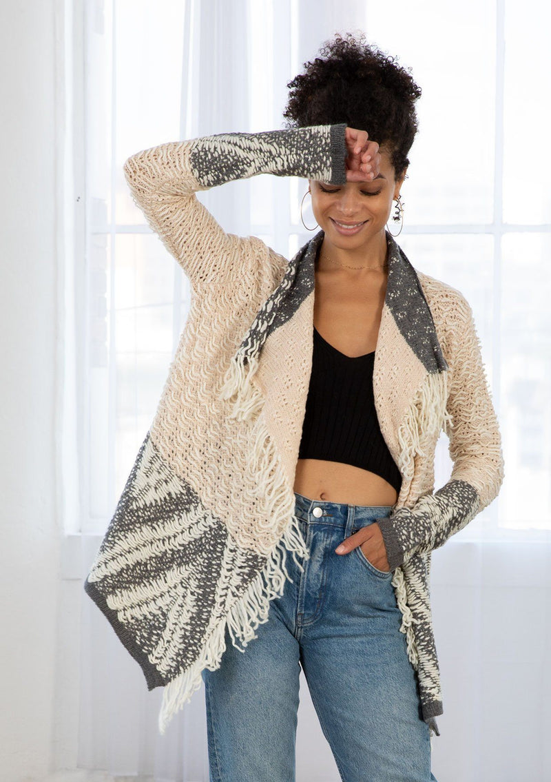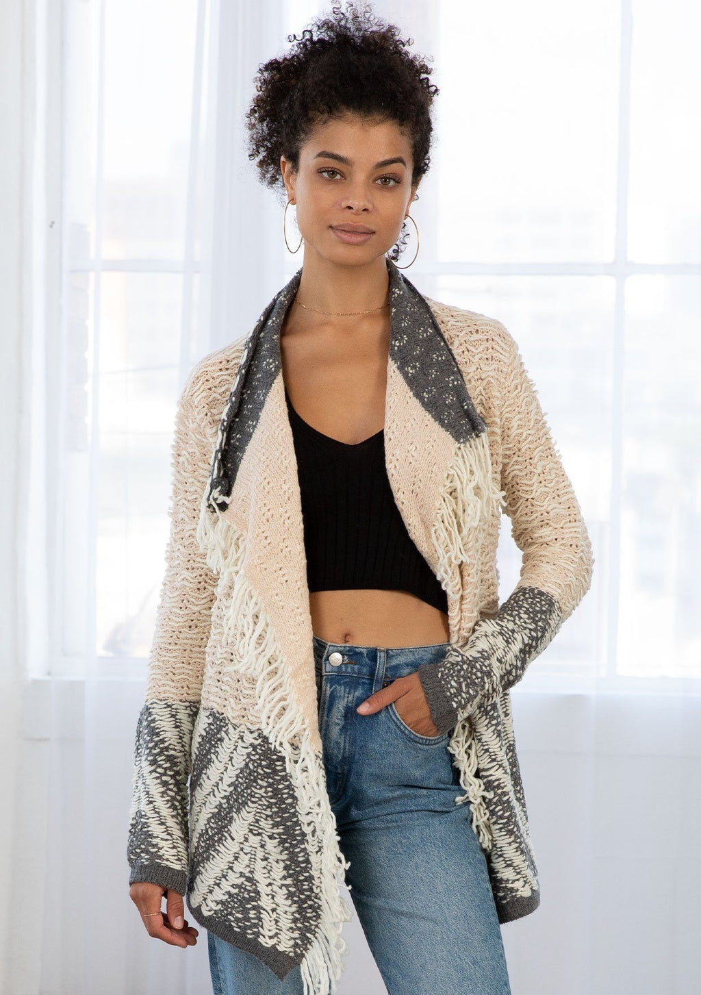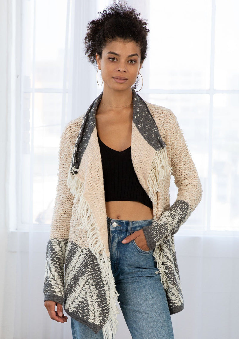 ![[Color: Heather Nude/Charcoal] A model wearing a chunky marled knit bohemian cardigan in a grey and nude pattern. With a fringed hemline, long sleeves, and contrast trim.](http://www.shoplovestitch.com/cdn/shop/products/I-50036-grey-white-shawl-fringe-cardigan-9_160x.jpg?v=1748483095)