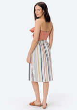 Rainbow striped, button front midi skirt with front floral embroidery.