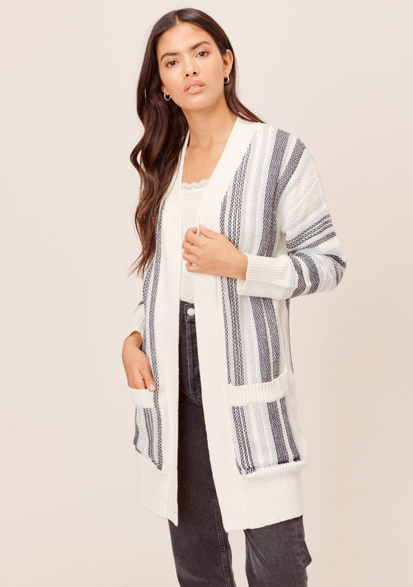 [Color: Blue Combo] Lovestitch Total beach vibes! Chunky, striped mid-length cardigan with deep side pockets and chic contrast rib detail- light blue, white and black stripes. The perfect cardigan for chilly beach days![Color: Blue Combo] Lovestitch Total beach vibes! Chunky, striped mid-length cardigan with deep side pockets and chic contrast rib detail. The perfect cardigan for chilly beach days!