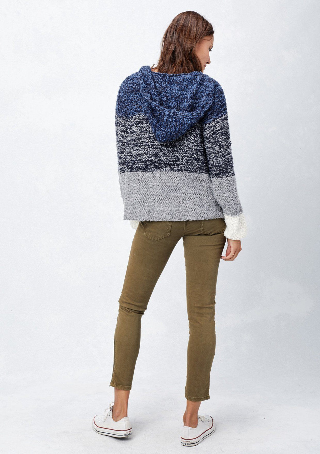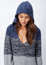 Long sleeve, deep V-neck, melange striped hooded sweater. Cozy and casual!