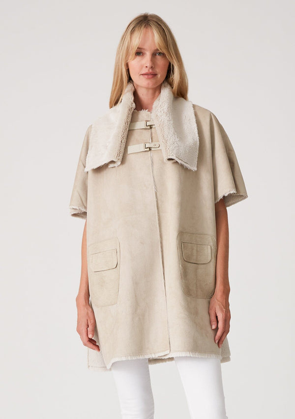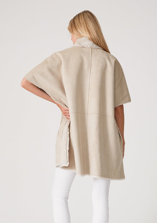 [Color: Heather Charcoal/Heather Cement] A full body front facing image of a blonde model wearing a soft and warm mid length sweater cape. An open front cape cardigan with a contrast border design. Perfect fall sweater, great for layering. [Color: Heather Charcoal/Heather Cement] A front facing image of a blonde model wearing a soft and warm mid length sweater cape. An open front cape cardigan with a contrast border design. Perfect fall sweater, great for layering.