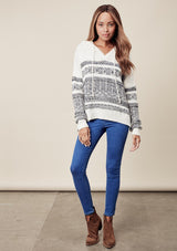 Cropped, V-neck, hooded pullover sweater with drawstring detail and tape yarn geometric motif throughout.