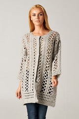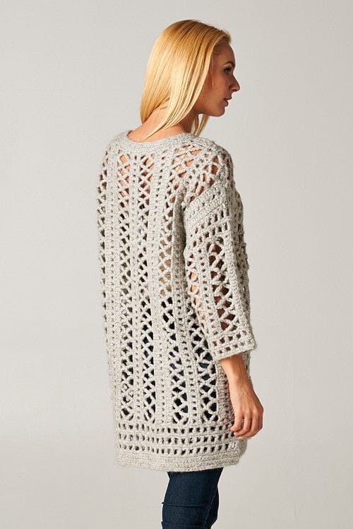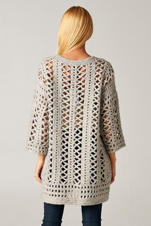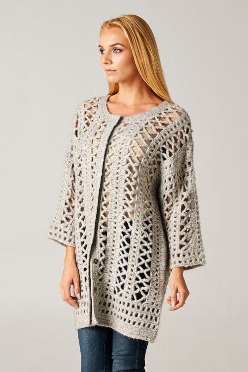 Shop NowThree-quarter sleeve, chunky, crochet cardigan with snap closure and a retro vibe is bound to make any basic outfit look special.
