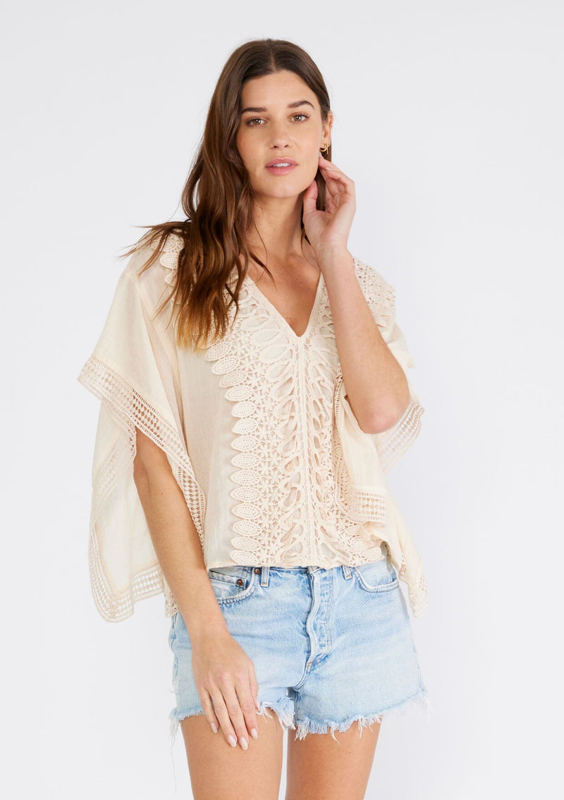 A must-pack style for the beach or your next vacation. This classic bohemian beach top features delicate crochet lace trim, a flattering v-neckline, and a relaxed, boxy fit.