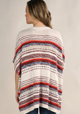 A lightweight colorful striped poncho sweater top with short sleeves and a v-neckline.