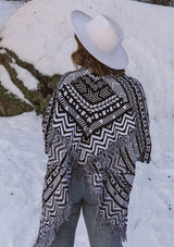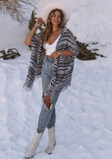 A bohemian cardigan with a beautiful Southwestern style pattern throughout. Featuring flattering three-quarter-length kimono sleeves and a fringed hemline. A cozy layering style that pairs well with denim.