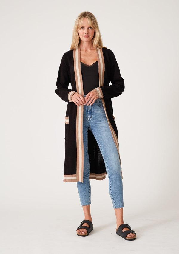 [Color: Black White Sky] An ultra fuzzy mid length cardigan in soft stripes. Features essential side pockets and an open front. Styled here with denim and camel boots for a classic Fall vibe. [Color: Black White Sky] An ultra fuzzy mid length cardigan in soft stripes. Features essential side pockets and an open front. Styled here with denim and camel boots for a classic Fall vibe.