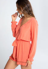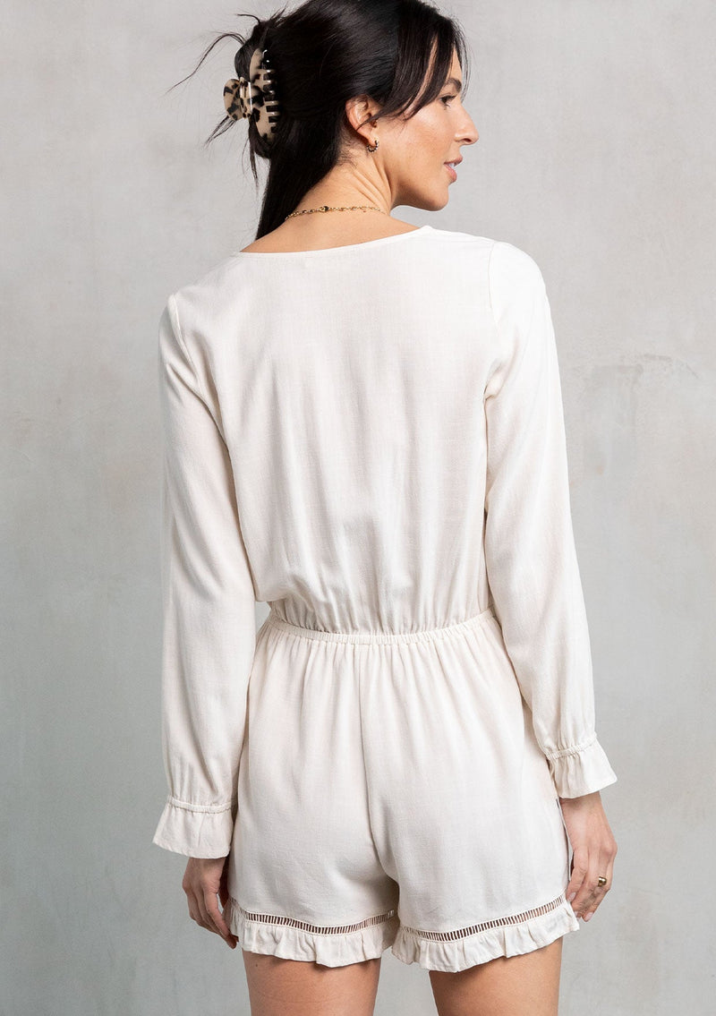 An ultra-charming short romper made from a cool linen blend. Featuring a long sleeve with a ruffled wrist cuff, ruffle-trimmed shorts, and an adjustable tie front waist. Perfect for Spring, we love to style this romper with a simple sandal.