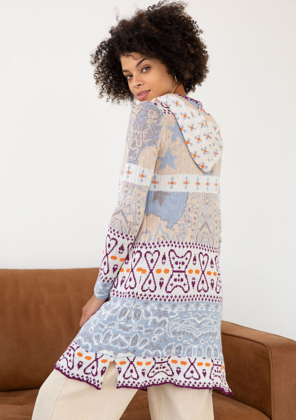 A laid-back mid-length cardigan with a mix of vibrant patterns.